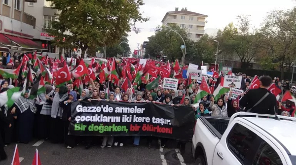 Yürüyüşte, İsrail’in Gazze’ye yönelik saldırıları protesto edildi. Cami önünde toplanan yüzlerce vatandaş, sloganlar atarak İlyasbey ve Bağdat Caddesi güzergahı üzerinden Kent Meydanı’na yürüdü.